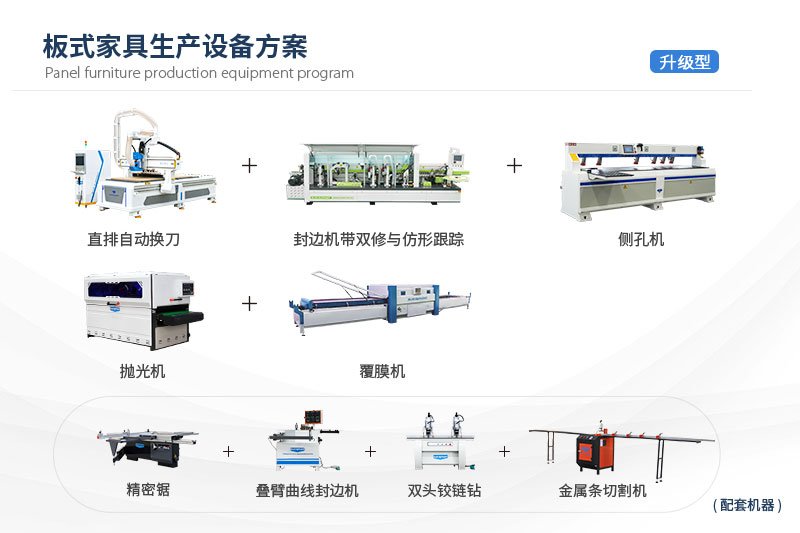 ?升級型-板式家具生產(chǎn)設(shè)備方案柜體/柜門(吸塑/平板)生產(chǎn)解決方案主要由直排換刀加工中心、封邊機(jī)、側(cè)孔機(jī)、拋光機(jī)、覆膜機(jī)、精密鋸、疊臂封邊機(jī)、雙主軸鉸鏈鉆、金屬條切割機(jī)組成,可滿足全屋定制廠家的生產(chǎn)加工,機(jī)器